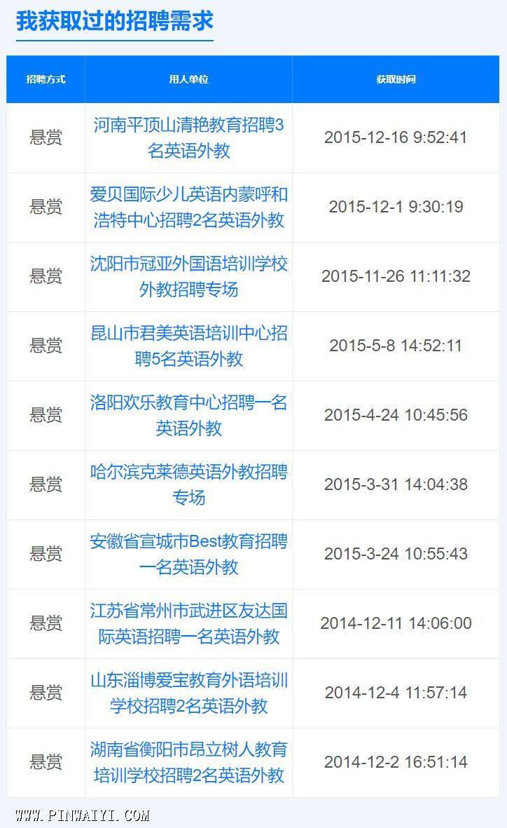 時(shí)光都去哪兒了,轉(zhuǎn)眼間聘外易上線即將9年了。 趁雙12來臨之際,我們特推出一期有獎(jiǎng)?wù)魑奶貏e期,請(qǐng)講講你在聘外易的故事,主題:我和聘外易共成長(zhǎng),不少于1000漢字,題材不限。 稿費(fèi)標(biāo)準(zhǔn): 普通投稿者(免費(fèi)TEFL書籍二本=約60元/千字,免快遞費(fèi))。 行業(yè)投稿者和簽約投稿者(60-100元/千字。) 參與對(duì)象:外教中介機(jī)構(gòu)/工作室 活動(dòng)時(shí)間:雙12活動(dòng),咨詢本頁所列客服 特別信息:外教中介機(jī)構(gòu)/工作室登錄之后可看到自己賬號(hào)獲取招聘需求的歷史記錄,快登錄看看這些年咱接了哪些需求吧!