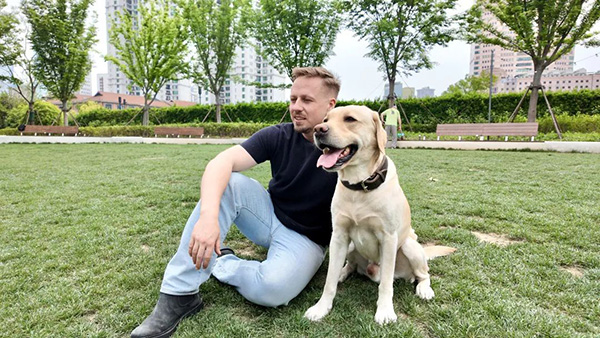 清晨,蘇州河在薄薄的晨霧中被喚醒。連同蘇州河一同“蘇醒”的,還有德國小伙阿福thomas derksen,以及他的愛犬愛因斯坦。 這是《外籍人才講靜安故事》第一季攝制組跟蹤記錄的第二天。在靜安(上海外教招聘)生活了十八年的阿福,此刻正行走在蘇州河畔,其身后是一幅流動(dòng)的城市畫卷。 而隨著這幅城市畫卷徐徐打開的,還有阿福寫給靜安的這一封《十八年的“城市情書”》。 阿福和愛犬愛因斯坦的蘇州河畔辰光 晨練結(jié)束,愛因斯坦輕車熟路地拐進(jìn)蘇河灣萬象天地的下沉廣場,草坪上已有五六只寵物犬追逐嬉戲——這里不僅是靜安打造“寵物友好天地”的商業(yè)綜合體,更是愛因斯坦的社交主場。