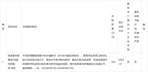 張家港市教育局(機關)2025年6月(第1批)政府采購意向公告 為便于供應商及時了解政府采購信息,根據(jù)《江蘇省財政廳關于做好政府采購意向公開工作的通知》等有關規(guī)定,現(xiàn)將張家港市教育局(機關)2025年6月(第1批)政府采購意向公告如下: