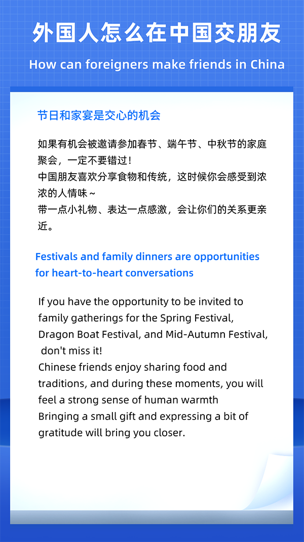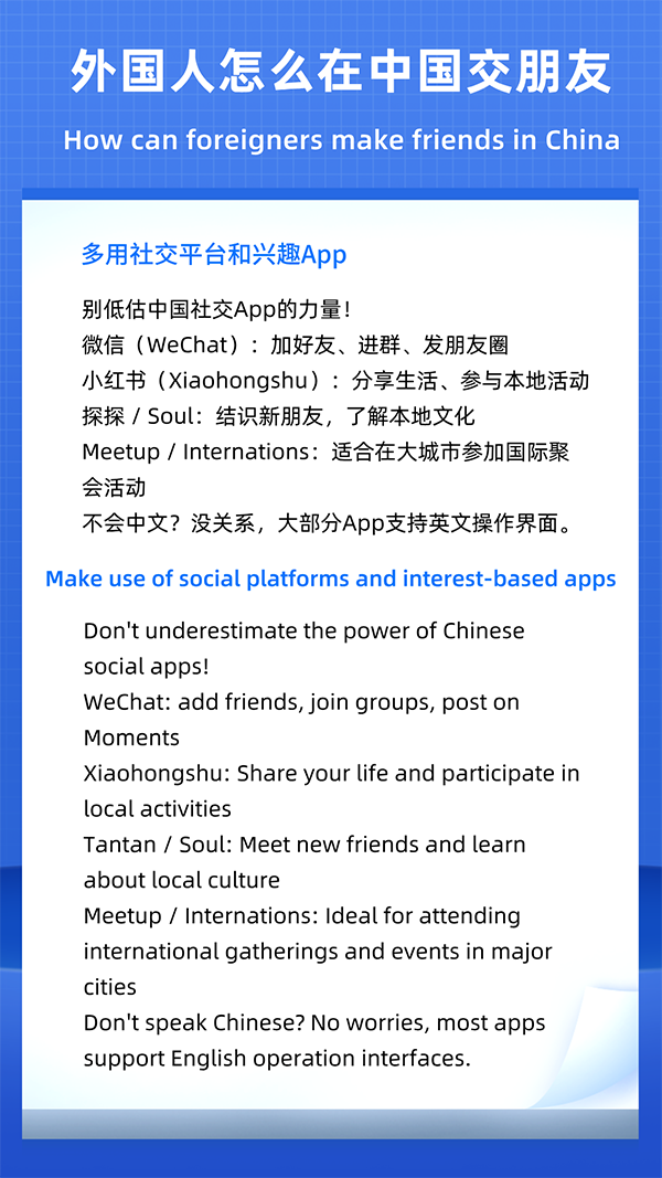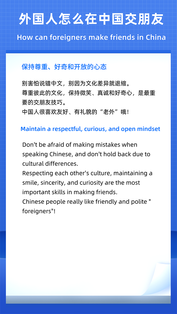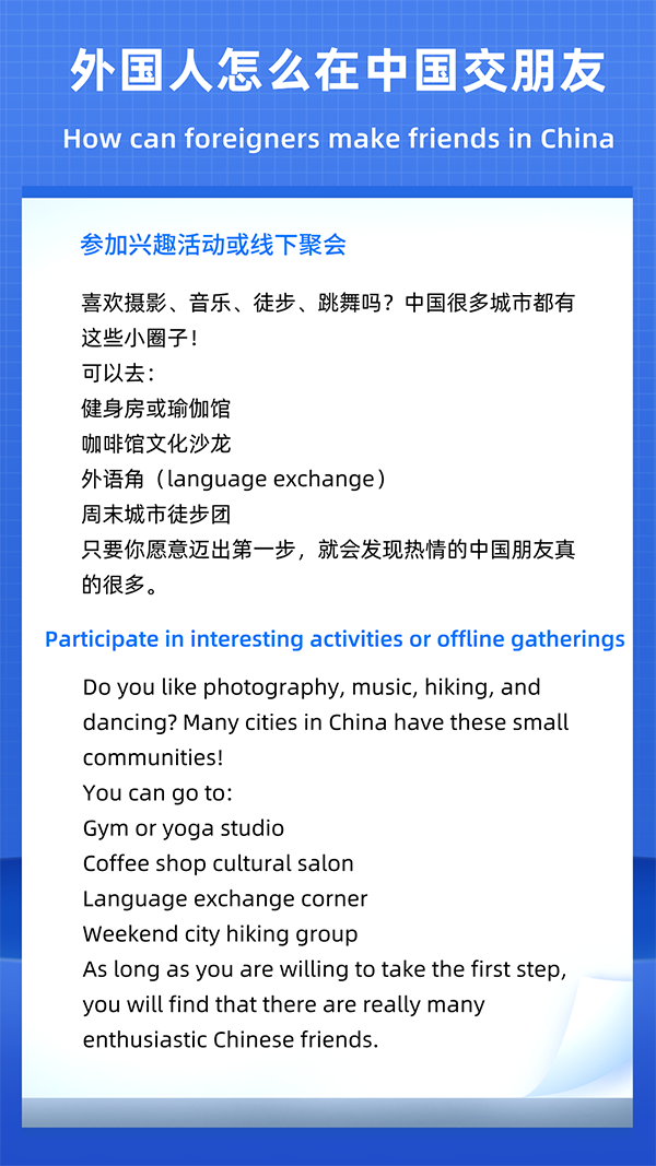 其實,只要方法對了,交朋友真的不難! Actually, as long as you have the right approach, making friends is really not difficult! 在中國交朋友的秘訣,不是你說得多好,而是你有沒有一顆愿意了解和融入的心。 The secret to making friends in China is not how well you speak, but whether you have a heart willing to understand and integrate. 你會發(fā)現(xiàn),朋友不分國界,只要用心,就會遇見溫暖的人! You will find that friends know no borders. With sincerity, you will encounter warm-hearted individuals! 外國人怎么在中國交朋友? |