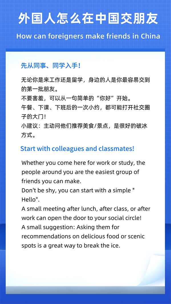 外國人怎么在中國交朋友? 很多剛來中國的外國朋友都會問我:“我不會中文,也沒有認識的人,在中國怎么交朋友呀?” Many foreign friends who have just arrived in China often ask me, "I don't speak Chinese and I don't know anyone. How can I make friends in China?"