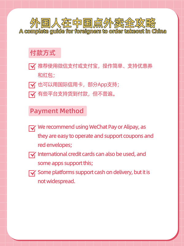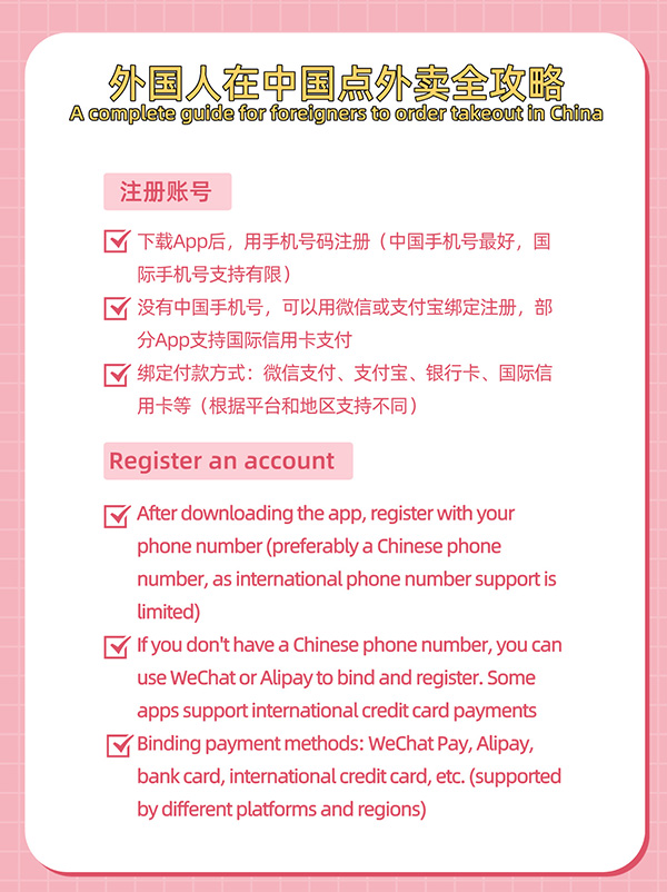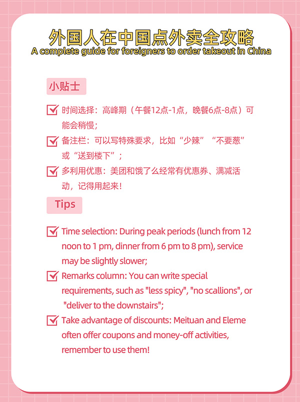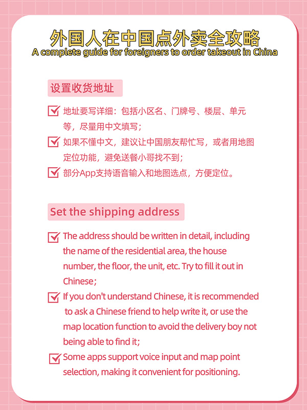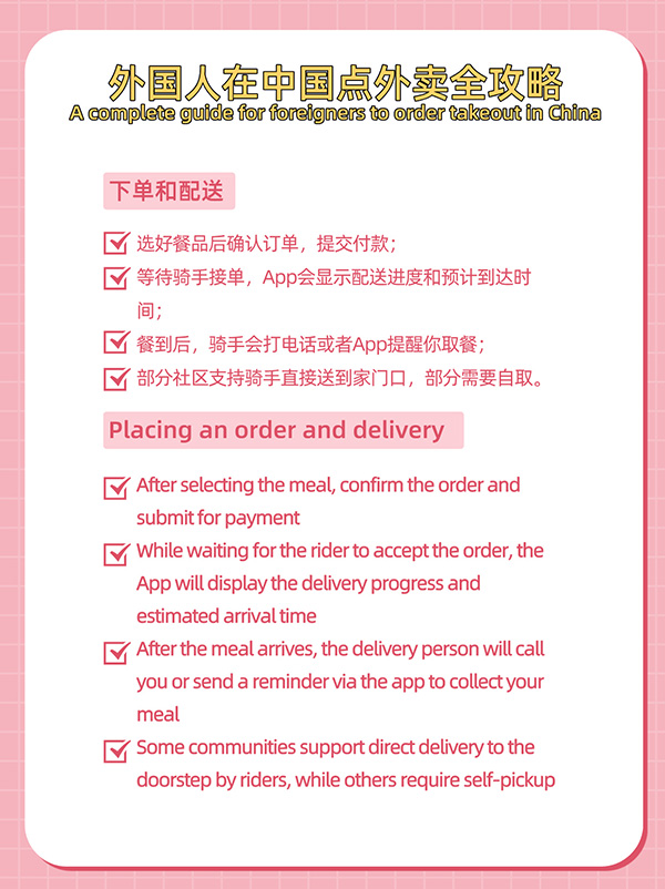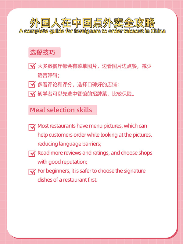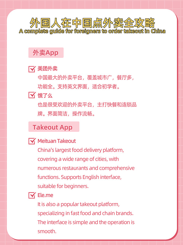 外國人在中國生活必備技能:點外賣 在中國,外賣真的是拯救生活的神器!從早餐到宵夜,從生鮮水果到生活用品,只要動動手指,分分鐘送到家。 Living in China, food delivery has truly become a lifesaver! From breakfast to late-night snacks, from fresh fruits to household supplies, everything can be delivered to your doorstep with just a few clicks. 但對外國朋友來說,第一次點外賣可能會有點懵。別擔(dān)心,小編已經(jīng)幫你整理好一份超實用的外賣攻略,讓你輕松解鎖中國式便捷生活。 But for foreign friends, ordering takeout for the first time might be a bit confusing. Don't worry, I've compiled a super practical takeout guide for you, allowing you to easily unlock the Chinese-style convenient life.