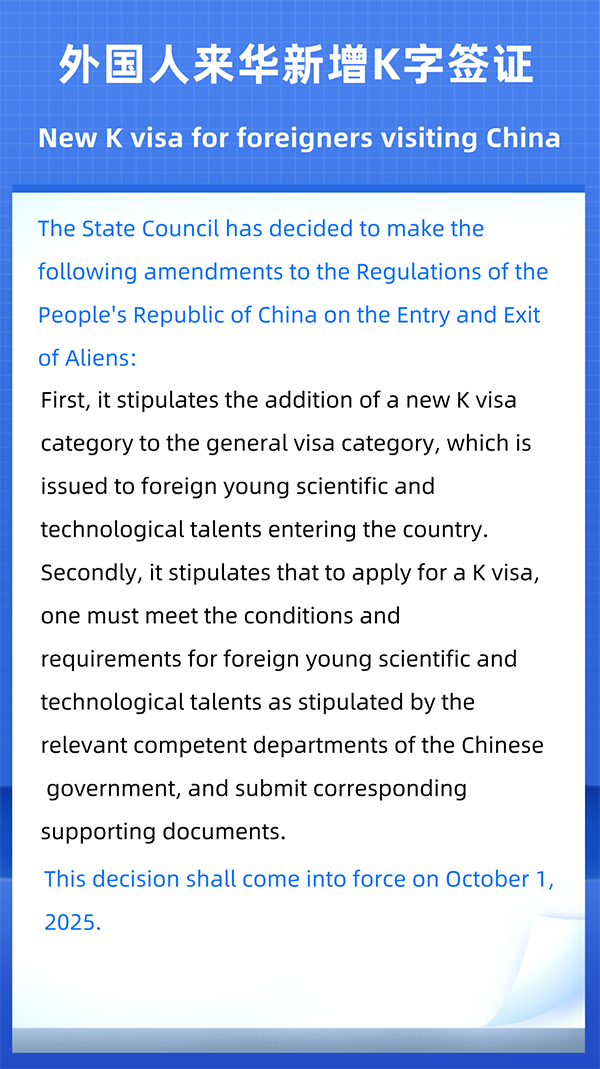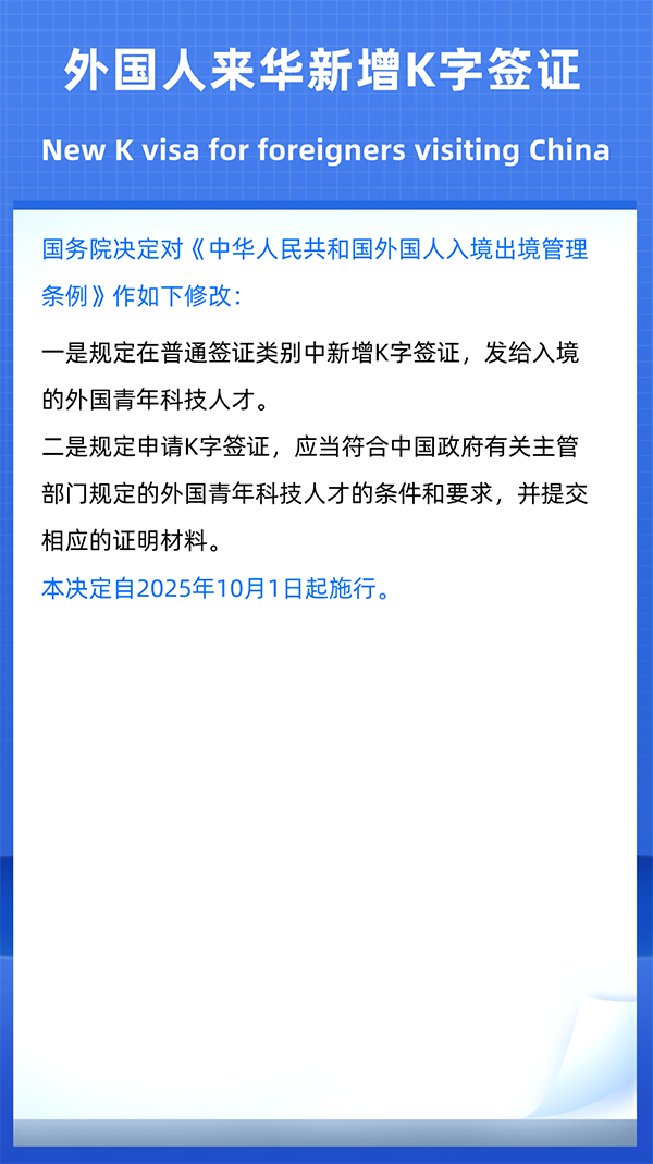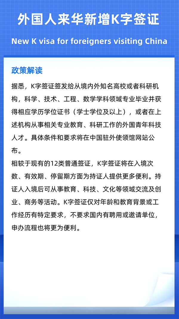 最新簽證福利,中國(guó)新增K字簽證,專(zhuān)屬外國(guó)青年科技人才 重磅消息!中國(guó)新增一種全新的簽證類(lèi)別— K字簽證,10月1日起正式施行。 Breaking news! China has introduced a brand-new visa category - the K visa, which will officially come into effect on October 1st. 對(duì)于想來(lái)中國(guó)發(fā)展的外國(guó)青年科技人才來(lái)說(shuō),這絕對(duì)是個(gè)超級(jí)利好!不僅讓來(lái)華工作、交流更便利,也傳遞出中國(guó)持續(xù)擴(kuò)大開(kāi)放、歡迎國(guó)際合作的信號(hào)。 For young foreign scientific and technological talents who aspire to develop in China, this is undoubtedly a tremendous benefit! It not only facilitates working and exchanging ideas in China, but also sends a signal that China continues to expand its openness and welcomes international cooperation.
