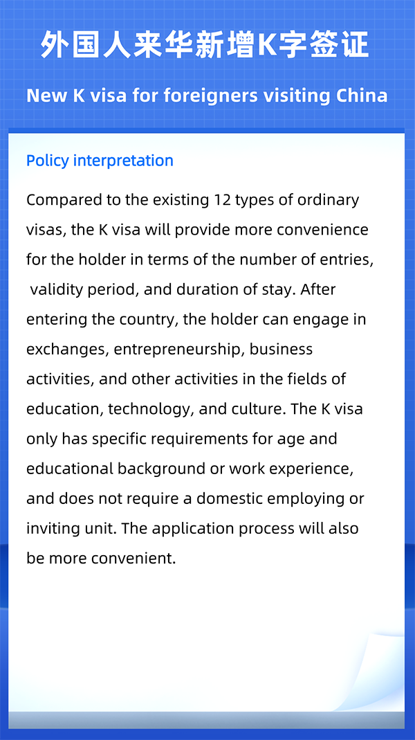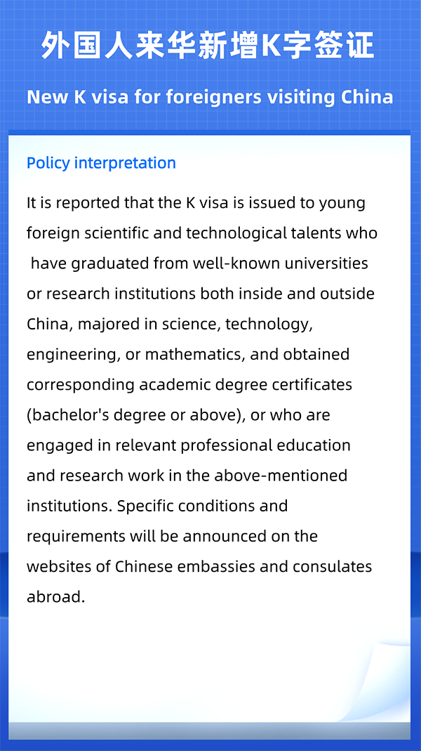 目前具體的申請(qǐng)條件和材料清單尚未公布,預(yù)計(jì)會(huì)在 10月1日 前正式釋出。準(zhǔn)備來(lái)中國(guó)的外國(guó)朋友,可以關(guān)注我們,不錯(cuò)過(guò)第一手信息! The specific application requirements and material checklist have not been announced yet, and are expected to be officially released before October 1st. Foreign friends planning to come to China can follow us to avoid missing out on the first-hand information! 最新簽證福利,中國(guó)新增K字簽證,專(zhuān)屬外國(guó)青年科技人才 |