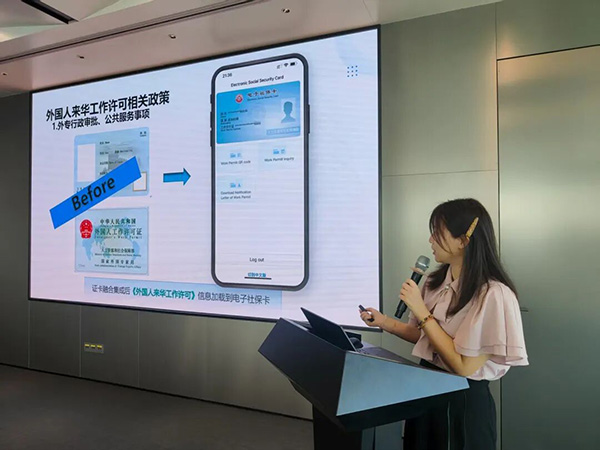 在外國人來華工作許可解讀環(huán)節(jié),區(qū)人才服務(wù)中心的人才服務(wù)專員詳細(xì)講解了工作許可證分類標(biāo)準(zhǔn)、人才案例和創(chuàng)新服務(wù)舉措,助力企業(yè)留住外籍人才。