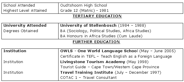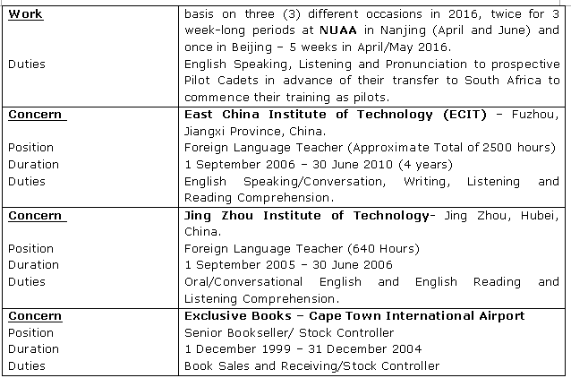 國(guó)籍: 津巴布韋 求職意向: 教師