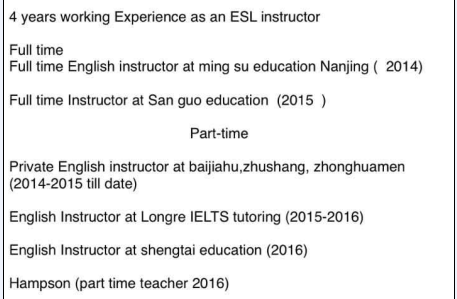 外教現(xiàn)在浙江杭州,有教學(xué)經(jīng)驗,在杭州的海倫多蘭,漢普森工作過。 |