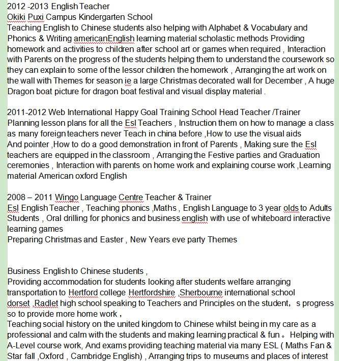 外教現(xiàn)在上海,碩士學(xué)位,有8年的教學(xué)經(jīng)驗(yàn),4年的少兒的教學(xué)經(jīng)驗(yàn),有TESOL證書,要求在上海工作,薪資要求18000以上??梢员M快到崗,現(xiàn)在沒有工作。 |