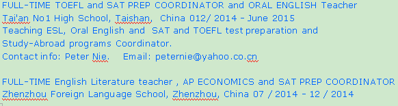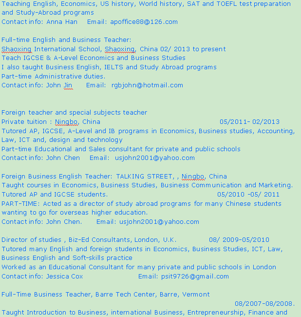 美國(guó) 耶魯大學(xué)畢業(yè) 62歲 25年教學(xué)經(jīng)驗(yàn) 可以教English, Economics, Business Studies, ICT, Accounting, Finance, Law, World History Teacher. Also, as a Consultant and Administrator of Schools and College system 現(xiàn)在武漢 10年L簽 只在武漢 意向教8-20歲 |