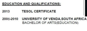 喀麥隆男外教 在南非的大學(xué)拿的本科 有tesol證書 英語教育專業(yè) 符合辦工簽 現(xiàn)在沈陽 學(xué)生簽 可盡快到崗 有教學(xué)視頻 有教學(xué)經(jīng)驗(yàn) |