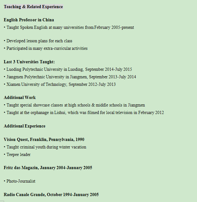 國籍: 美國 求職意向: 教師