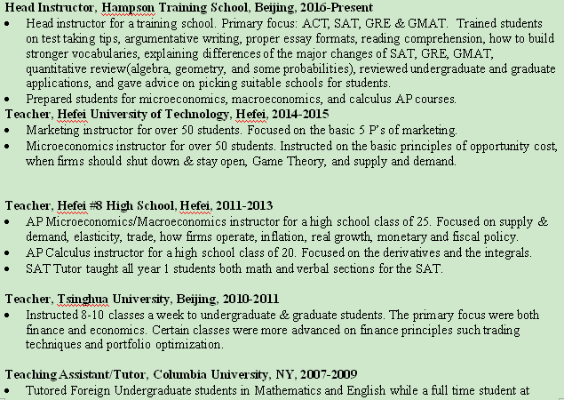 美國 數(shù)學碩士 5年經驗 可以教AP數(shù)學微積分 微觀宏觀經濟學 SAT, GRE, GMAT 在清華大學 合肥工業(yè)大學教過 現(xiàn)在北京做培訓學校的Head instructor Q簽 |