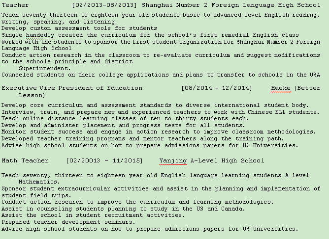教學(xué)專業(yè)碩士 6年經(jīng)驗(yàn) 可以教ESL, Math and IT 求職北京公立學(xué)校 幼兒園到大學(xué) 薪資25000 9月份到崗 |