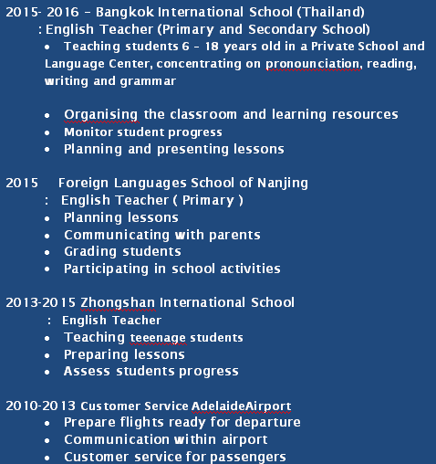 澳大利亞現(xiàn)在深圳 5年教學(xué)經(jīng)驗 教過高中 也教過小孩和成人 有TESOL 沒本科 求職深圳 盡快到崗 |