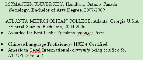 巴哈馬女 在加拿大拿的本科 TESOL 2年以上經(jīng)驗(yàn) 現(xiàn)在北京 L簽 求職朝陽或海淀 |