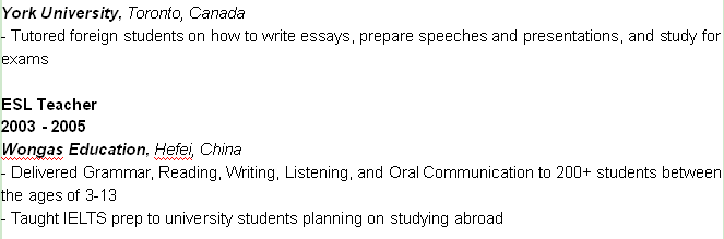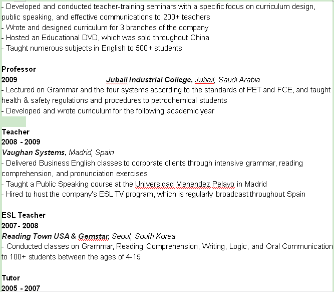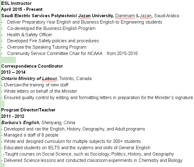 加拿大男 現(xiàn)在沙特 本科 CELTA 求職9月份工作 可以教項目管理,課程開發(fā),項目管理教師培訓(xùn)、商務(wù)英語、EAP、ESP、雅思、PET、FCE、KET、TTT、PPP、健康與安全、政治科學(xué)、地理、歷史、社會學(xué)、生物學(xué)、化學(xué)、音樂、戲劇、藝術(shù)、研究與分析分析思維 薪資15000-20000 |