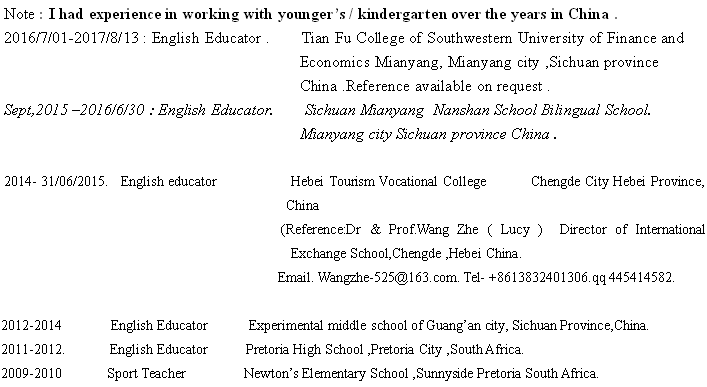 國(guó)籍: 南非 求職意向: 教師