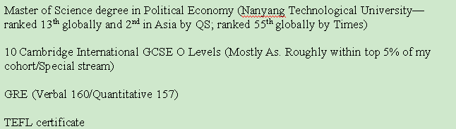 新加坡 碩士TEFL 現(xiàn)在本國(guó) 可以教經(jīng)濟(jì)學(xué) 英語(yǔ) 求職大連 廣州深圳東莞等環(huán)境好的城市 |