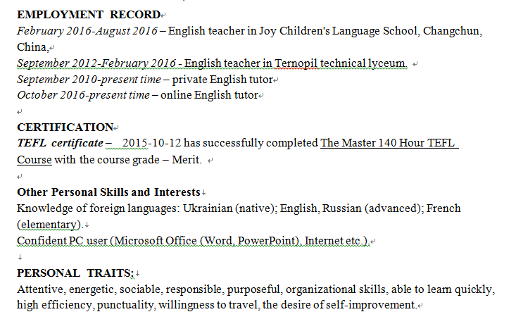 國籍: 烏克蘭 求職意向: 教師