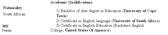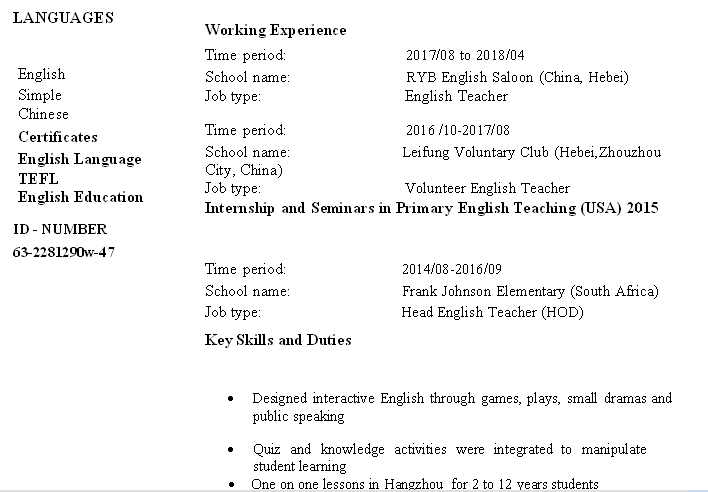 南非 本科, 教育專業(yè), 在杭州, 學生簽, 在讀碩士的最后一年, 可以全職, 薪資10K 有經(jīng)驗 。杭州附近工作。 |