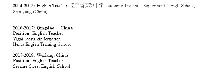 西班牙 在紐約長大, 現(xiàn)在濰坊, 求職德州工作, 妻子是德州人, 確定工作可以一個月周到崗,, 會英語, 發(fā)音好,會音樂, 可以在音樂中教孩子學(xué)校。 很喜歡孩子 |
