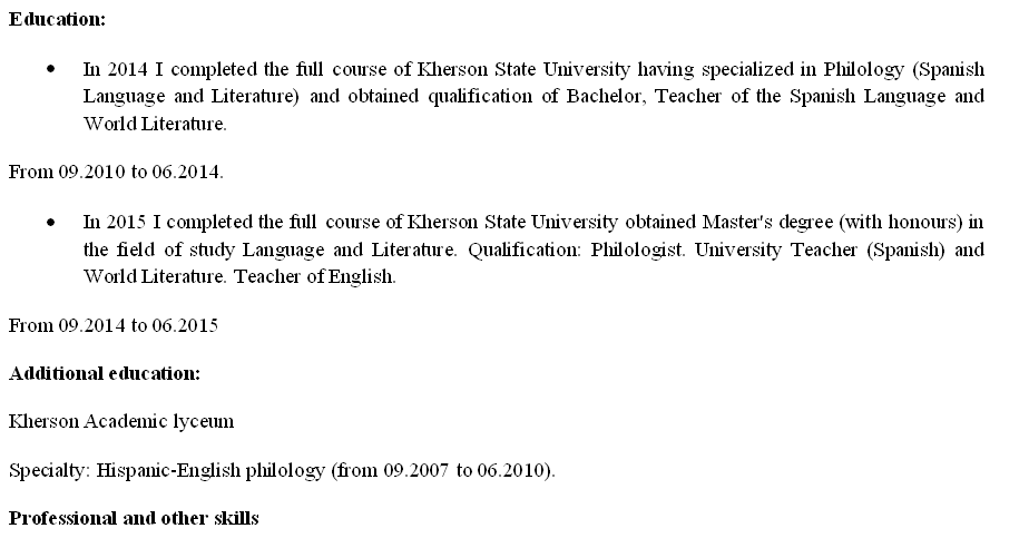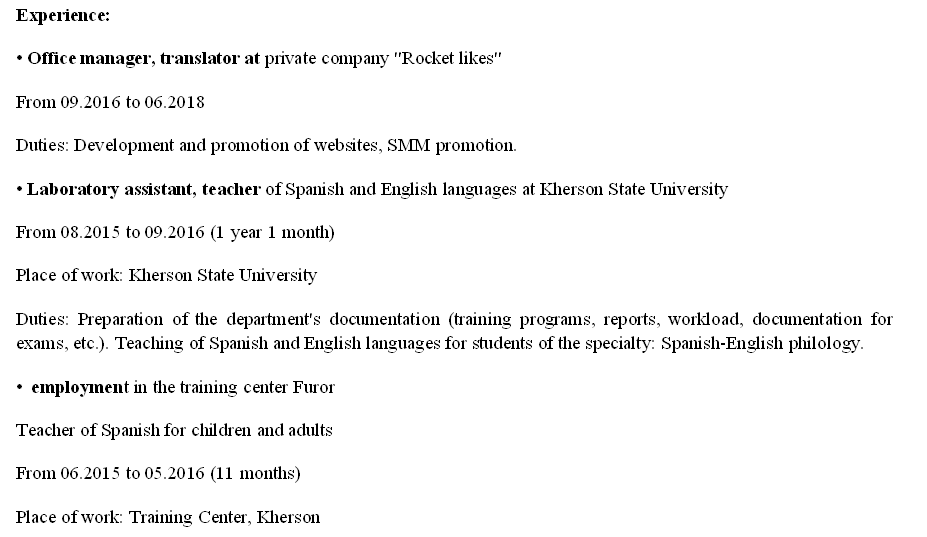烏克蘭 碩士學(xué)位, 主修英語和西班牙語, 在大學(xué), 培訓(xùn)機(jī)構(gòu)都有經(jīng)驗(yàn),經(jīng)驗(yàn)大約3年, 有tefl , 求職 可以辦理辦工簽的學(xué)校 |