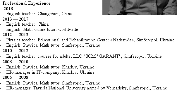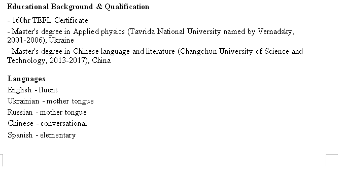 國籍: 俄羅斯 求職意向: 教師