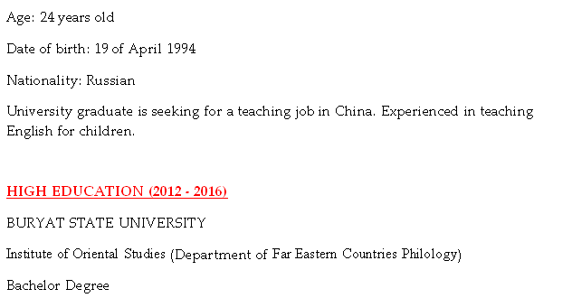 國(guó)籍: 俄羅斯 求職意向: 教師