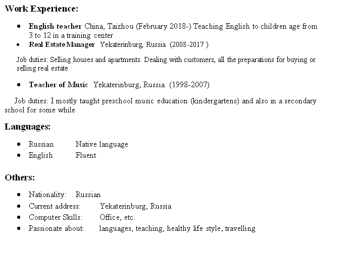 國籍: 俄羅斯       求職意向: 教師