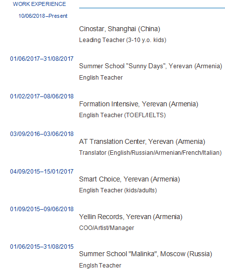 國籍: 俄羅斯 求職意向: 教師