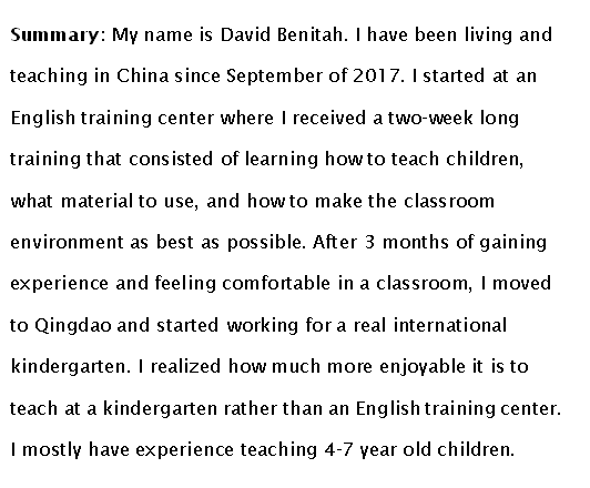面試詳情:『大城市』的用人單位可約該外教面試,目前還沒有用人單位約該外教面試。