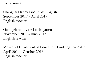 國籍: 俄羅斯 求職意向: 教師
