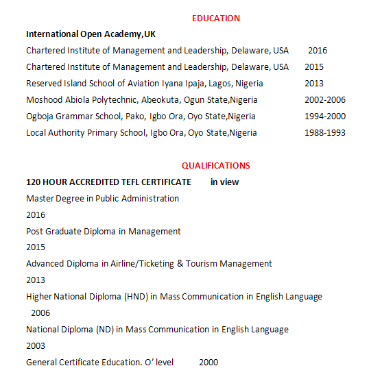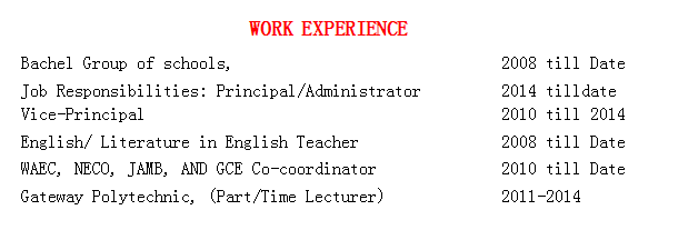 一直在尼日利亞拉各斯一所著名的中學(xué)教英語(yǔ)。曾擔(dān)任過(guò)系主任(HOD)、副校長(zhǎng)、學(xué)校公關(guān)官,現(xiàn)在擔(dān)任校長(zhǎng)。為理工學(xué)院的學(xué)生講課,為100至200名本科生講授英語(yǔ)和溝通技巧等課程。 |