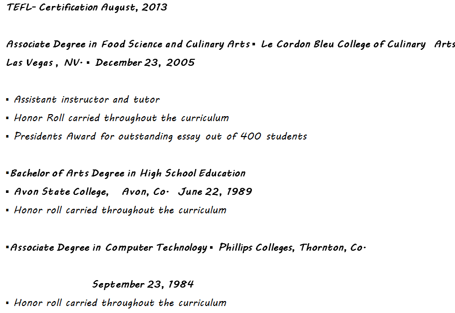 Le Cordon Blue College of Culinary Arts- Las Vegas, NV. July 2003 to December 2005.