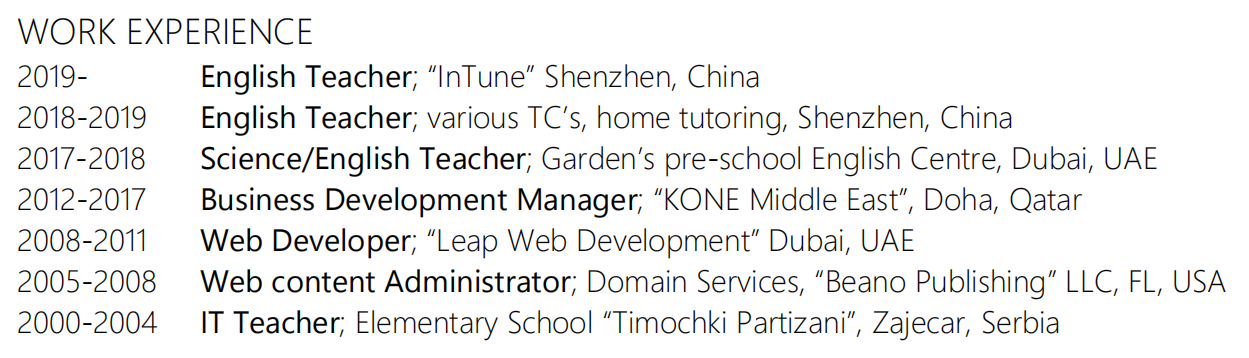 William+塞爾維亞男40歲+TEFL,TESOL+美國加州大學(xué)工商管理碩士+現(xiàn)在是免簽狀態(tài),但是自己可以拿到工作簽證+求職深圳,或者貴州,東莞,廣州,佛山+目前在深圳,可盡快到崗~發(fā)音很好 |