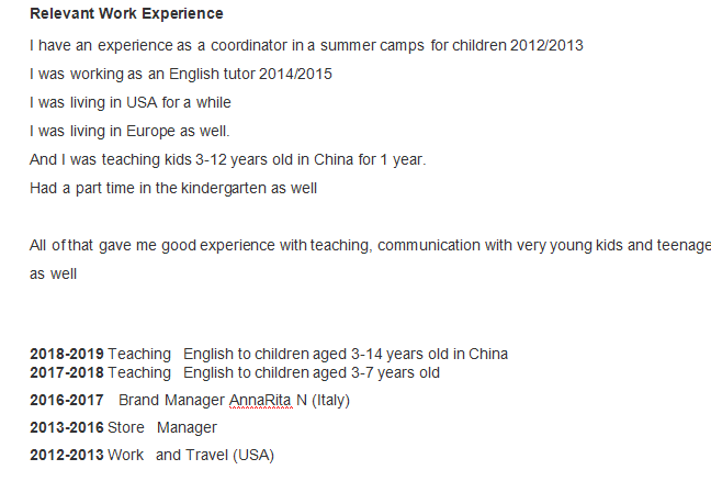 碩士,兩年教學(xué)經(jīng)驗(yàn),TESOL ,美國生活1年,商務(wù)簽(工簽資料已經(jīng)認(rèn)證) ,性格開朗 |