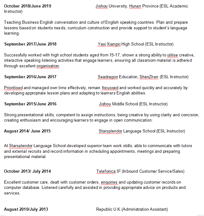本科,有tefl,經(jīng)驗4年,工簽資料已認證,求職長沙工簽職位 |