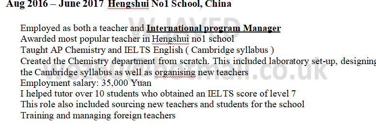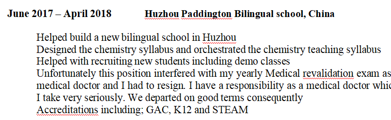 英國, 碩士, 可以是教授化學, 英語, 在衡水二中呆過,求職湖州職位, |