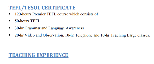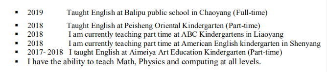 碩士學位,有 TEFL, 經(jīng)驗2年,學生簽 |