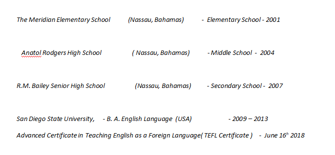 巴哈馬(母語(yǔ)), 英語(yǔ)語(yǔ)言學(xué)士(美國(guó)取得),有TEFL, 發(fā)音標(biāo)準(zhǔn),教學(xué)經(jīng)驗(yàn)6年(各年齡段),自理工作簽證一年,十一假期后開(kāi)始工作 |