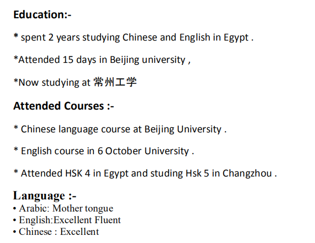 埃及 本科 漢語專業(yè) 兩年經(jīng)驗(yàn),學(xué)生簽 立刻到崗,求職常州 |