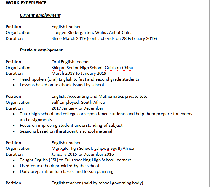 國籍: 津巴布韋 求職意向: 教師