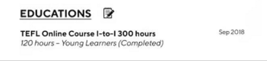 有tefl, 學習能力強,愛跳舞, 教學風格活潑 |