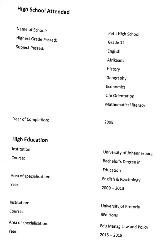 南非,在本國(guó), 本科 教育專業(yè) , 有高中, 初中和小學(xué)經(jīng)驗(yàn), 南非約翰內(nèi)斯堡大學(xué)畢業(yè), 求職可以辦理工作簽的學(xué)校。 ![]() 全部資料都有。 |