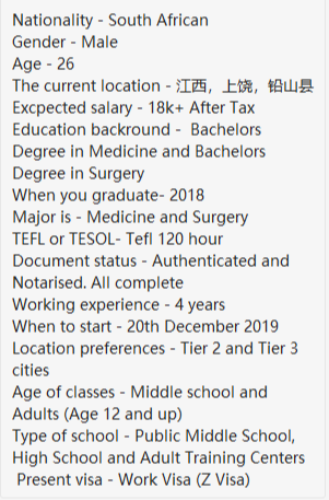 本科,經(jīng)驗(yàn)4年,有TESOL,教學(xué)類工簽轉(zhuǎn),現(xiàn)于江西公立學(xué)校,求職2,3線城市公立學(xué)校,12月底工作,18k +, 發(fā)音非常好,最好和女朋友一個(gè)學(xué)校  |