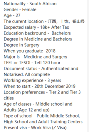 本科,經(jīng)驗都3年以上,有TESOL,教學類工簽轉(zhuǎn),現(xiàn)于江西公立學校,求職2,3線城市公立學校,12月底工作,18k +, 發(fā)音非常好 ,最好和男朋友一個學校 |