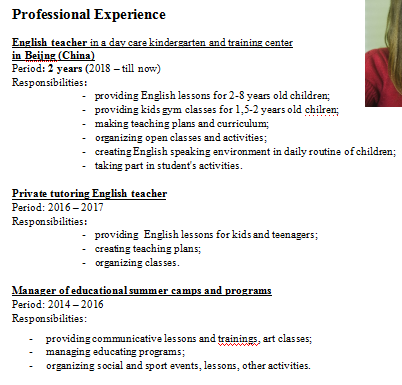 Maria+烏克蘭美女+英語(yǔ)教師專業(yè)本科+2年中國(guó)教學(xué)經(jīng)驗(yàn),曾4次去美國(guó)參加體育項(xiàng)目,也到過(guò)波蘭+管理類工簽轉(zhuǎn)聘+求職北京幼兒園+目前在北京,2020.1月初到崗~發(fā)音好,形象好 ,開朗自信 |