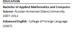ENGLISH LANGUAGE TEACHER – LinguaMan LLC Jun.2019-Sep.2019/ Yerevan, Armenia ENGLISH LANGUAGE TEACHER – Domus Linguae LLC Sep.2018-Sep.2019/ Yerevan, Armenia DEPUTY HEAD OF THE CASHIER - OJSC “ Unibank “ Aug.2017-Sep.2018/ Yerevan , Armenia CASHIER-MANAGER - OJSC “ Unibank “ Apr.2015- Aug.2017/ Yerevan , Armenia KNDERGARDEN NANNY - Erebuni kindergarten № 71 Dec.2013-Feb.2015 / Yerevan, Armenia