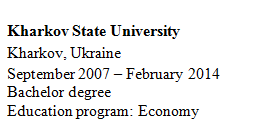 Dance group at she sсhool ?Hope? Kharkov, Ukraine March 2014 - February 2015 Dance teacher. ?Teach dance to children, work with them. On holidays, we studied thematic songs with elements of dance. We made sets and costumes by ourselves. Studied national and modern dances. ?Communicate with parents and colleagues. Kindergarten ?Chamomile? Ekaterinburg, Russia September 2015 –June 2018 English and dance teacher ?Teach English to children, work with them, take part in different performances. I usse flash cards in a playful way: play with children, drawing with children. ?After lunch, we studied English songs and danced. Language summer camp “ BAMBOOK” Ekaterinburg, Russia July 2018 – September 2018 English teacher ?In the process of learning English, we had a wonderful time acquiring valuable skills, the ability to work in a team and self-confidence. Actively used English in everyday life in games and songs. Dance with children, drawing with children.
