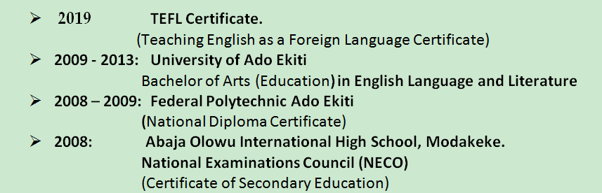 Organization: University of Ado Ekiti Nursery and Primary school. Duration: October 2014 to August 2017. Designation: Kindergarten Classroom Teacher Duties: ? Positively impacted classroom activities by utilizing overhead projectors, computers, and movies, outside speakers, puzzles gearing lessons both visually and conceptually. ? Maintaining the academic related data of the students and discussing it with parents. ? Recognizing the weak and strong areas of students as well as helping them for being efficient areas. ? Analyzing teaching material for the positive results and creating study material according to the ages of the students. ? Manage classroom coverage of 10th grade classes; ? Assume all responsibilities of regular classroom teacher, including professional development, communications with parents, and assessment of students and staff meetings. ? Perform basic administrative duties such as recording attendance and organizing student’s portfolios. ? Provide individual assistance to students as needed. ? Incorporate constructive philosophy of teaching into classroom by implementing various students – centered learning methodology. ? Significantly enhanced the classroom environment by acting as facilitator to promote student leadership in initiating and creating positive learning opportunities.